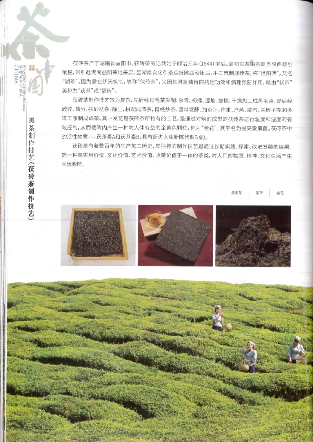 茯磚茶產(chǎn)于湖南省益陽市,是后發(fā)酵茶,又屬于全發(fā)酵茶。其所含的益生菌-冠突散蘘菌是茯茶必備的獨有品質(zhì)特征。茯磚茶是邊銷茶的主要品種之一,是西北各名族人民的生活必需品。茯磚茶,唐代以后被官府所控用來茶馬交易,亦稱府茶、官茶。因茯茶對西北各族人民的重要性又被稱之“福茶”。存放完好的茯茶歷久彌香,存放時間越長,茶湯越趨橙紅明亮,也越耐沖泡。茯磚茶中俗稱的“金花”(冠突散蘘菌)能有效調(diào)節(jié)人體新陳代謝,調(diào)理腸胃,并有降脂、降壓、調(diào)節(jié)糖類代謝的功效。