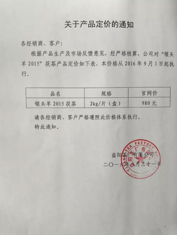 根據產品生產及市場反饋意見,經嚴格核算,公司對“領頭羊2015”茯茶產品定價如下表,本價格從2016年9月1日起執(zhí)行。